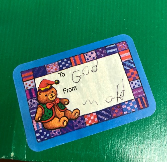 I recently came across a treasure in a file drawer at work. A Christmas gift from around 1999 or 2000 made by my oldest daughter (she would have been around 3 or 4 at the time)…….for God.